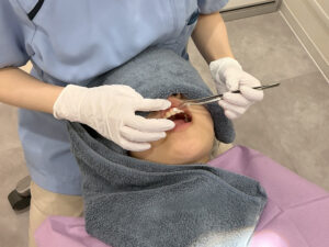 口腔内チェックでは、必要に応じてお子さまのお口の中を簡単に確認します。歯や歯茎の状態、虫歯の有無、歯並びのチェックなどを行い、今後のケアや治療の方針を立てるための参考にします。初めての歯科医院で緊張してしまうお子さまの場合は、まずキッズルームでリラックスしていただきながら進め、安心感を持っていただけるよう配慮します。
