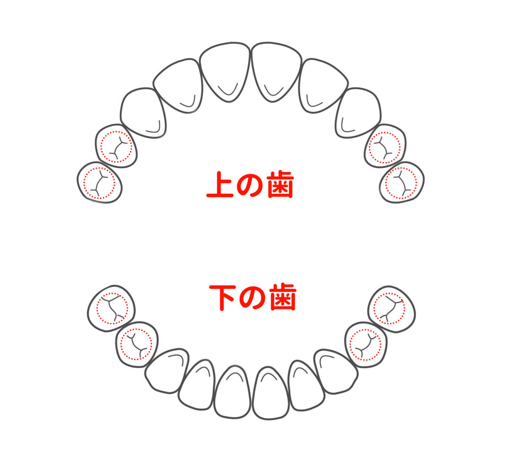 奥歯の噛み合わせの溝が深く、歯ブラシが届きにくいため、汚れが溜まりやすく、虫歯になりやすいです。数年経つと咬む面が摩耗してきて、溝が浅くなり虫歯になりづらくなります。従って萌出直後が1番虫歯になりやすいです。