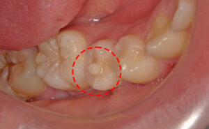 中心結節とは、主に下顎第2小臼歯(下の真ん中から5番目の歯)に見られる先のとがった突起状のふくらみです。この突起は円錐状や短い棒状の形をしており、咬合や咀嚼で折れて神経がむき出しになるリスクがあります。先天的な歯の形の異常の一つで、日本人の子どもに比較的多く見られます。